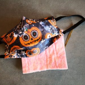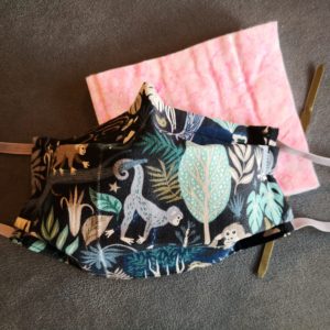 Mund-Nase-Bedeckung mit Filter und Nasenbügel aus zweilagigem Baumwollstoff mit Gummibändern.