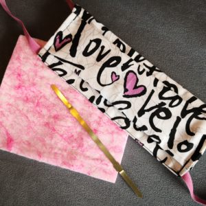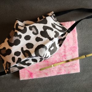 Mund-Nase-Bedeckung mit Filter und Nasenbügel aus zweilagigem Baumwollstoff mit Gummibändern.